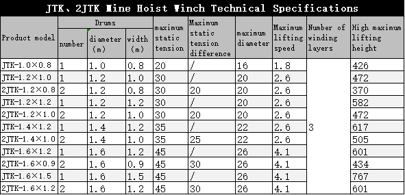 The JTK and 2JTK mine hoist winches consist of the main shaft assembly, safety brake, depth indicator, reducer, working brake system, gear coupling, electric motor, and electrical control system.